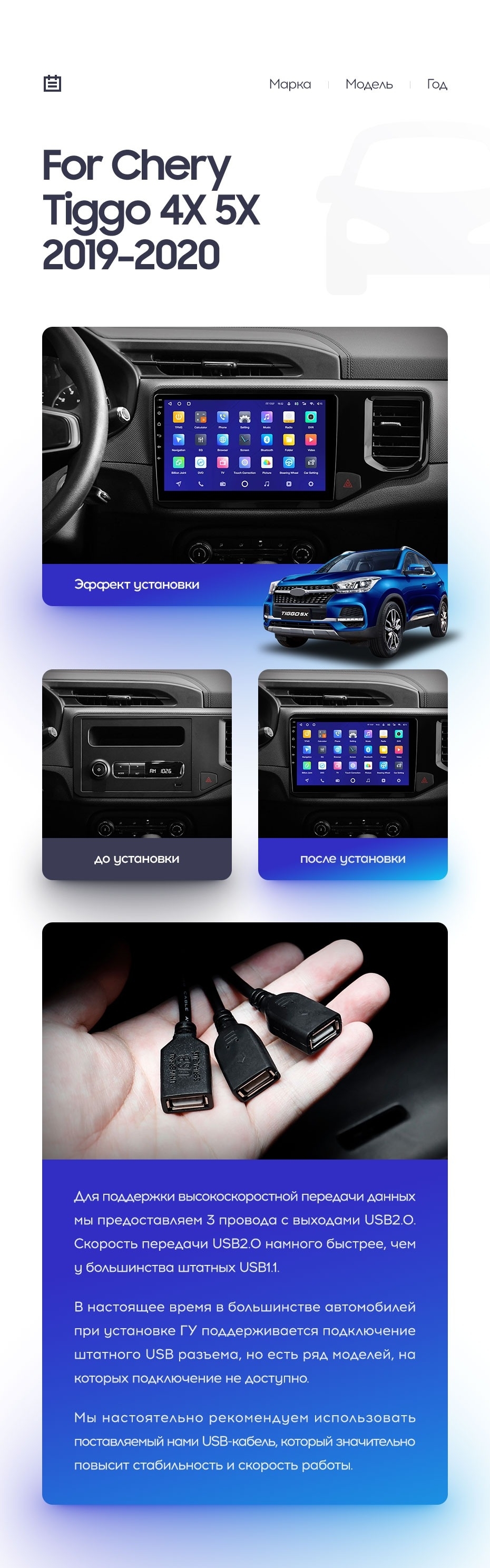 Полный комплект установки магнитолы Teyes с рамкой и проводкой можно выбрать в каталоге штатных магнитол Chery Tiggo 4X 5X (2019-2020).
