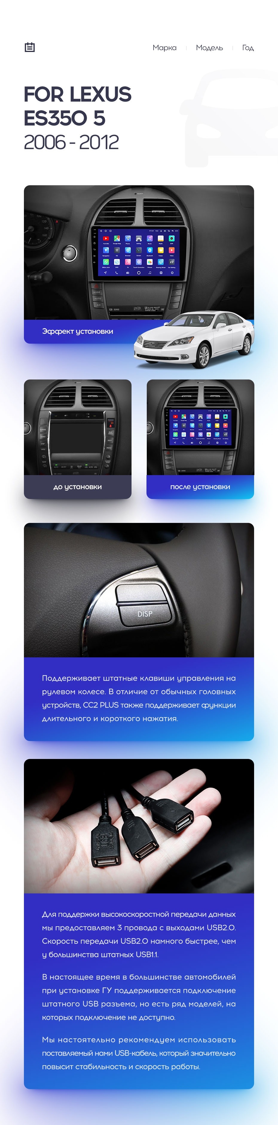 Полный комплект установки магнитолы Teyes с рамкой и проводкой можно выбрать в каталоге штатных магнитол Lexus ES350 5 V XV40 (2006-2012).