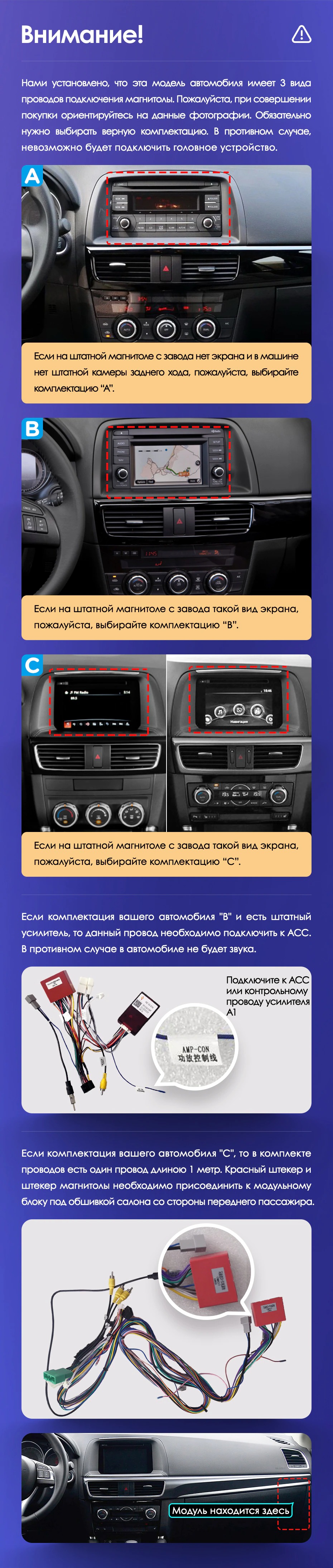 Установочный комплект для Mazda CX-5 (2012-2015) включает переходную рамку и проводку.