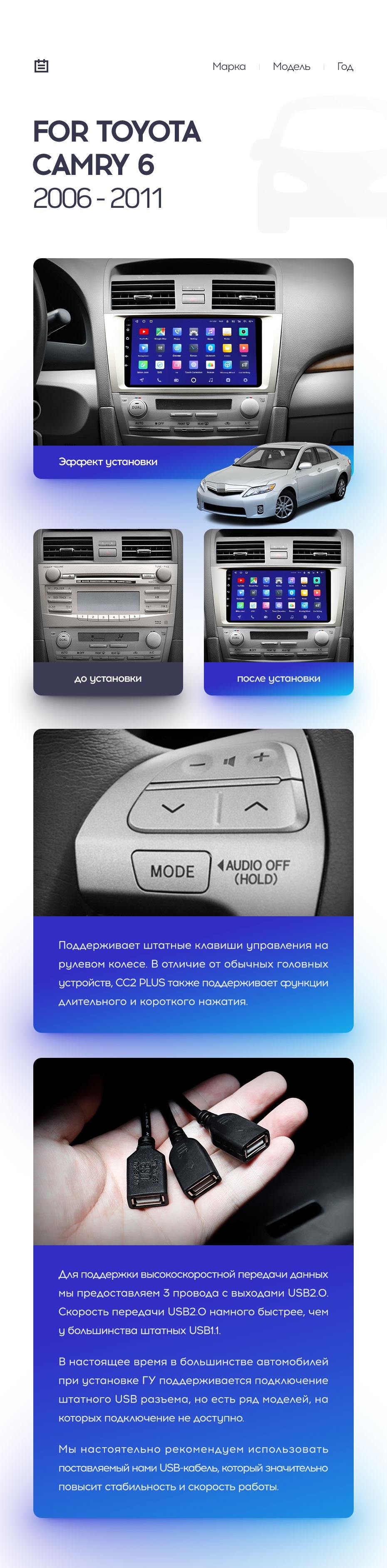 Полный комплект установки магнитолы Teyes с рамкой и проводкой можно выбрать в каталоге штатных магнитол Toyota Camry 6 XV 40 50 (2006-2011).