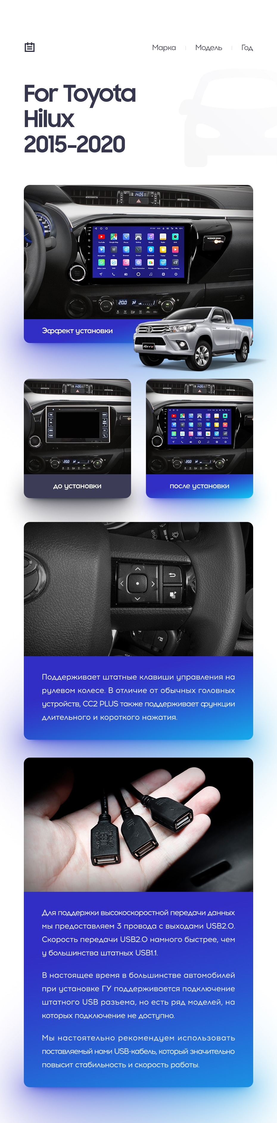 Полный комплект установки магнитолы Teyes с рамкой и проводкой можно выбрать в каталоге штатных магнитол Toyota Hilux Pick Up (2015-2020).