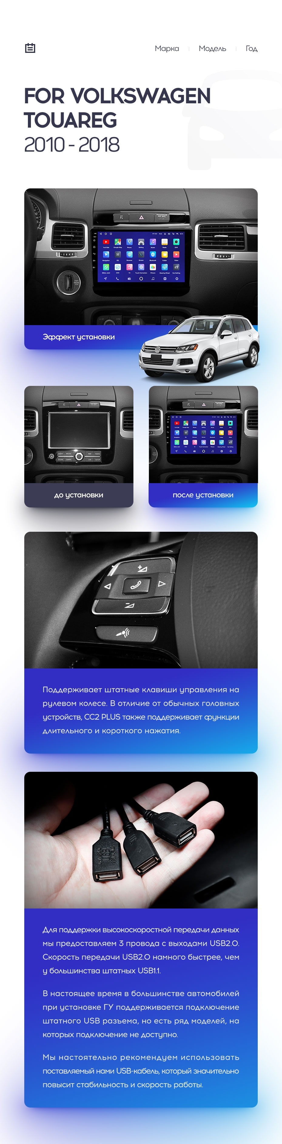 Установочный комплект для Volkswagen Touareg FL NF (2010-2018) включает переходную рамку и проводку.