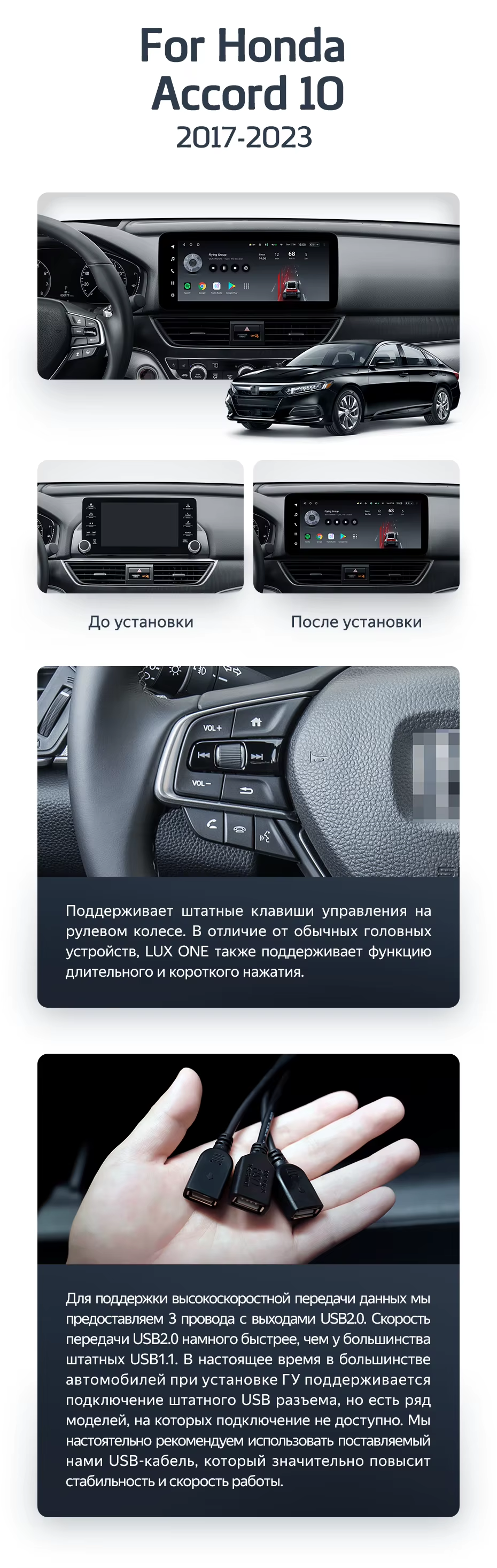 Полный комплект установки магнитолы Teyes с рамкой и проводкой можно выбрать в каталоге штатных магнитол Honda Accord 10 CV (2017-2023).
